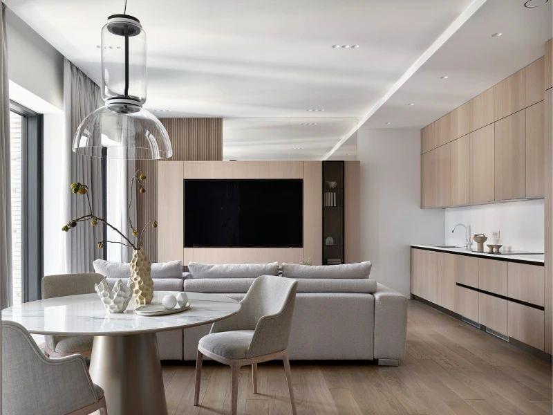 Нейтральная палитра, чистые линии мебели и обилие натуральных материалов — дерево, стекло и текстиль — в сочетании с мягким потолочным светом визуально расширяют пространство.