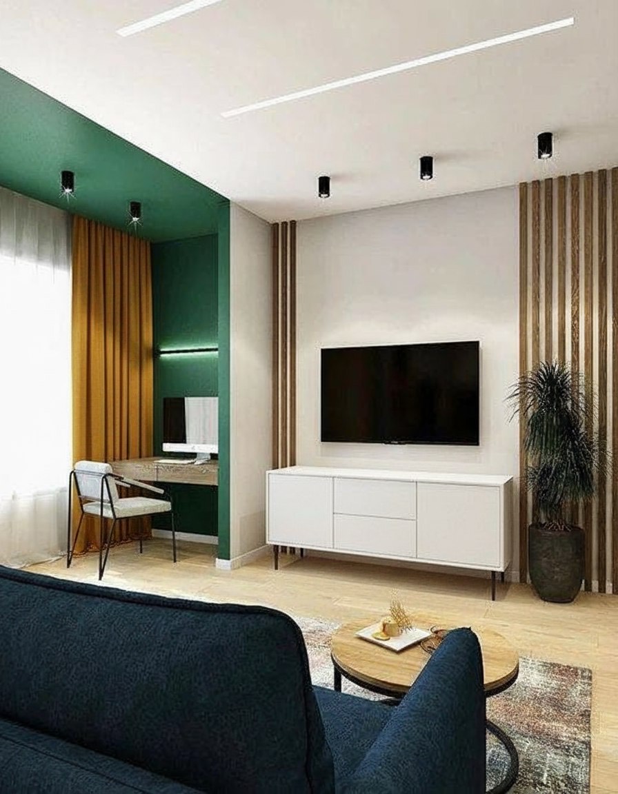 Для зонирования можно использовать цветовые акценты, различия в фактурах материалов и ковёр, чтобы создать ощущение отдельных зон (гостиная/рабочая зона).