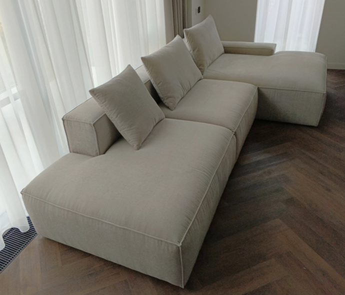Индивидуальное изготовление, срок производства 4-5 недель. Различные модули и компоновки, трехместные, угловые и П образные. Выбор любых тканей у нас в шоу-руме, инновационные экоматериалы. Звоните, мы поможем выбрать диван.