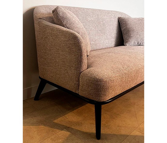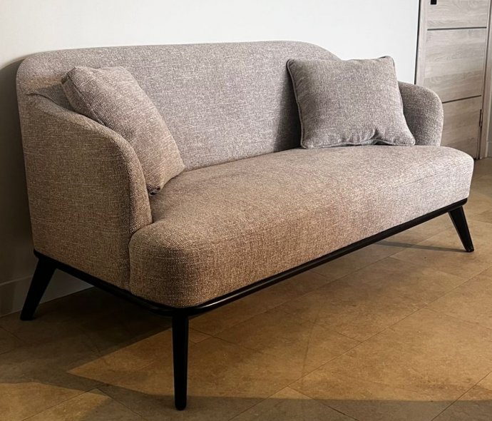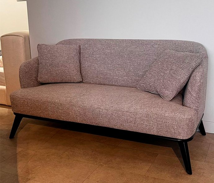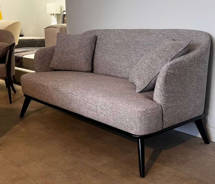 Малогабаритный диван с подиума продается с хорошей скидкой. Данный диван выполнен в шенилле Belen ( Устойчивость к истиранию: 100000 циклов). Материалы: многослойная фанера, высокоэластичный ППУ, корпус и ноги: дерево твердых пород, цвет венге. В комплект идет кресло Dijon.