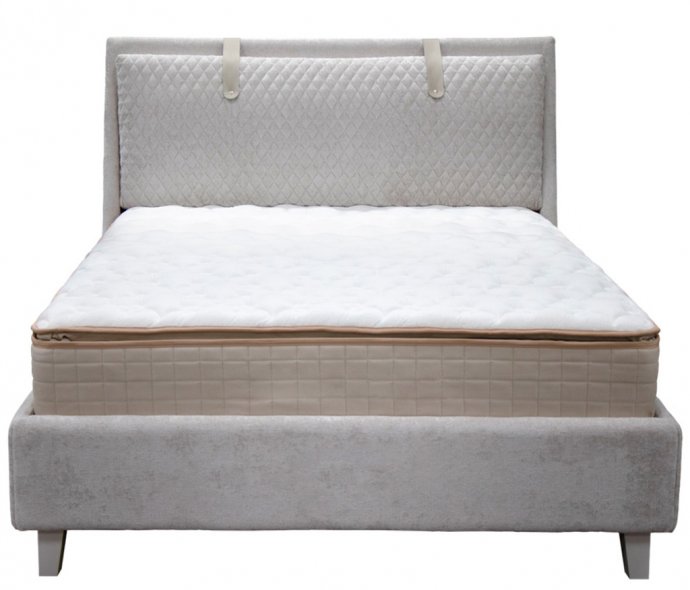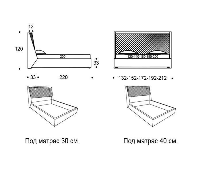 Рекомендуемая высота матраса - 30 и 40 см. Матрас по длине утоплен под подушку изголовья, за счет этого полезная площадь спального места уменьшается.